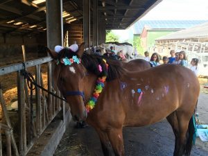 Onze paarden en pony’s zijn lief en gewend aan kinderen, ik laat mijn eigen kinderen met een gerust hart onder mijn begeleiding met hen bezig, maar het blijven dieren.